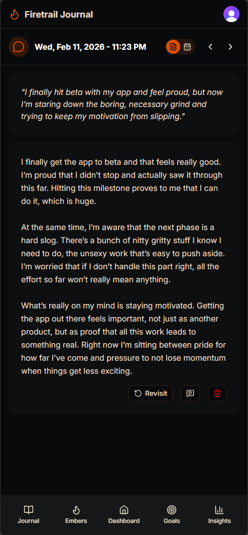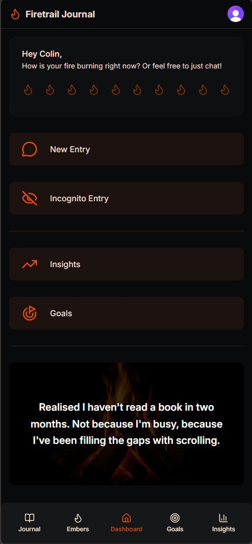 An AI-enhanced journaling app designed for men who want to build better mental health habits. Guided reflections, mood tracking, and intelligent prompts — all wrapped in a campfire-inspired experience.